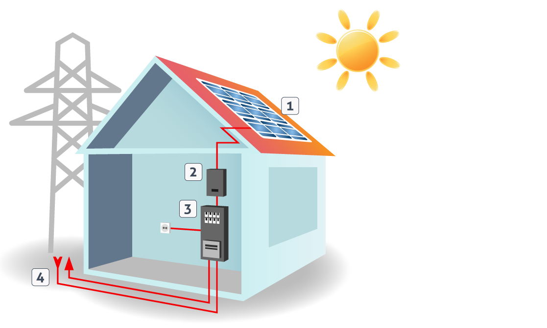 Zonnepanelen [1], ook wel pv-panelen genoemd, bestaan uit zonnecellen die daglicht omzetten in gelijkstroom. Een omvormer [2] zet deze stroom om in wisselstroom, zodat u de elektriciteit direct in huis kunt gebruiken voor bijvoorbeeld verlichting, apparaten of het opladen van een elektrische auto [3].